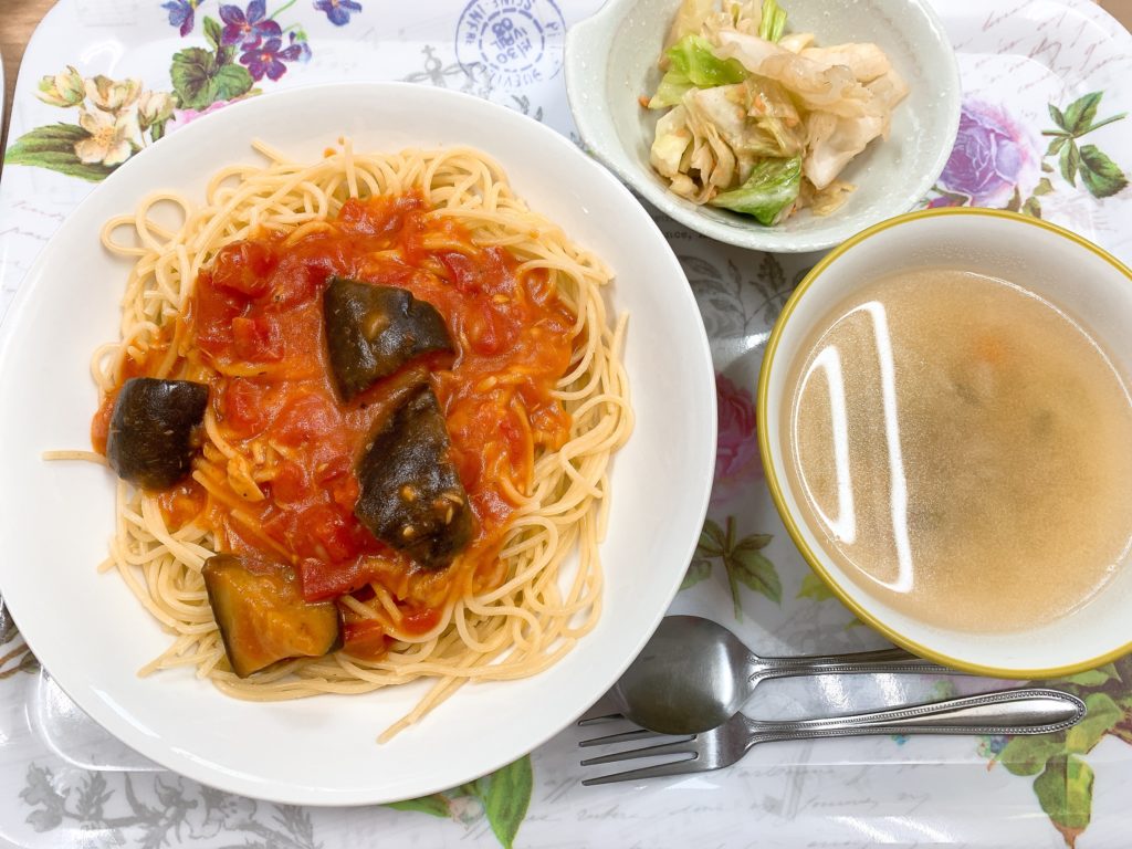 今日の昼食はツナとナスのトマトソースパスタ、キャベツの鮭フレーク和え、具沢山コンソメスープでした!