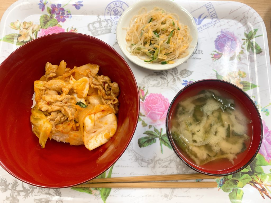今日の昼食は豚キムチ丼、春雨サラダ、ほうれん草と玉ねぎの味噌汁でした(●´ω`●)