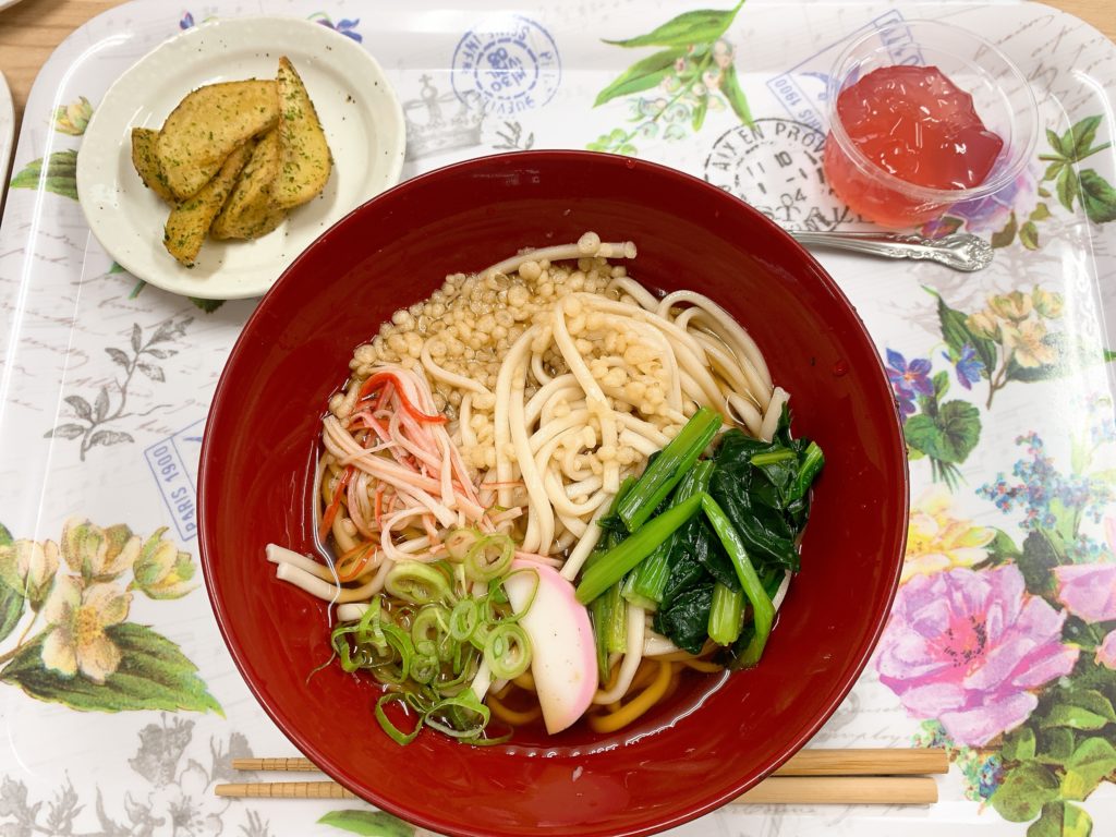 今日の昼食は冷やし五目うどん、青のりポテト、夏にぴったりなゼリーでした🎐✨