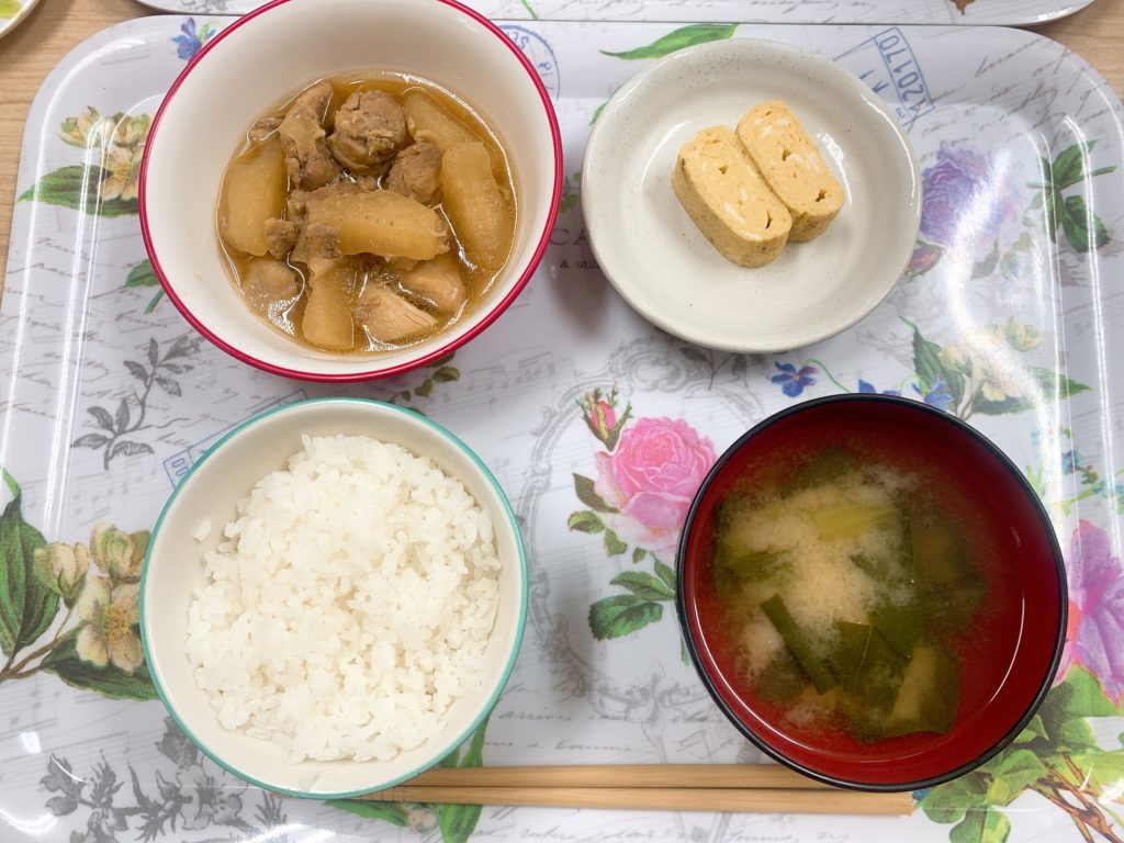 今日の昼食は鶏大根、出汁巻き卵、小松菜の味噌汁、白米でした(^^)/🍚