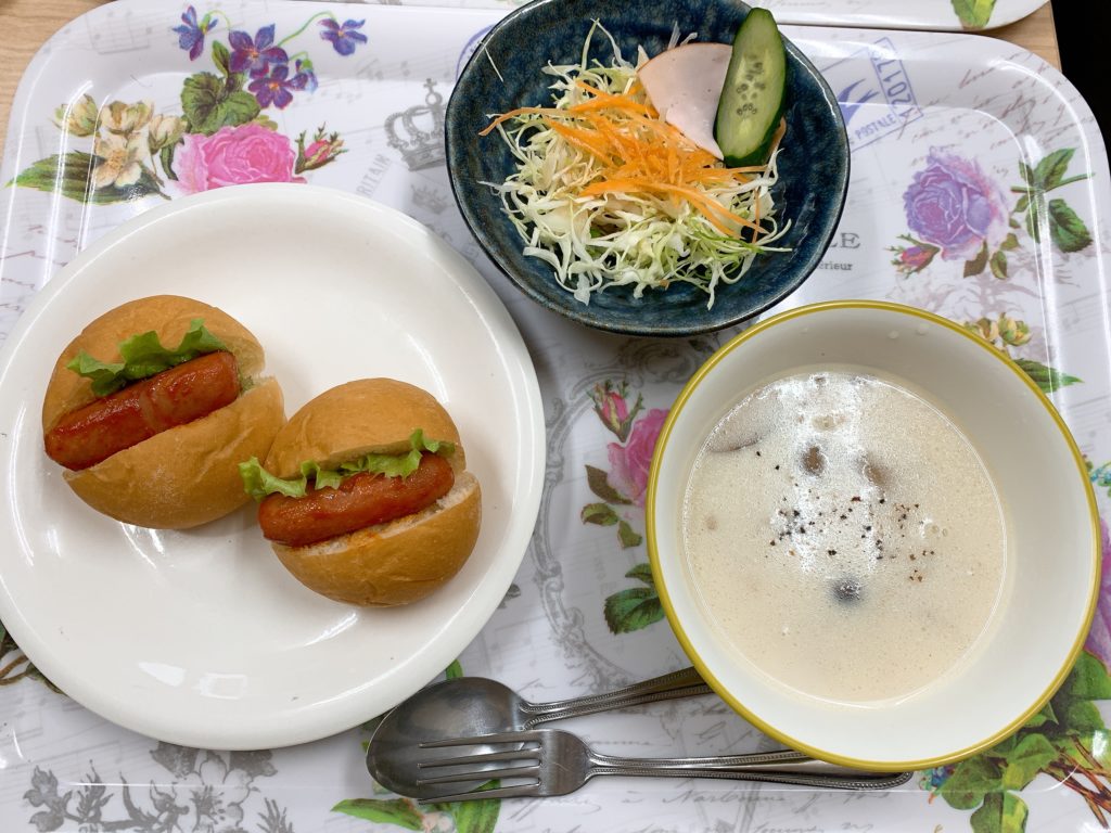 今日の昼食はミニホットドック、千切りキャベツのサラダ、キノコのクリームスープでした🍄🐄