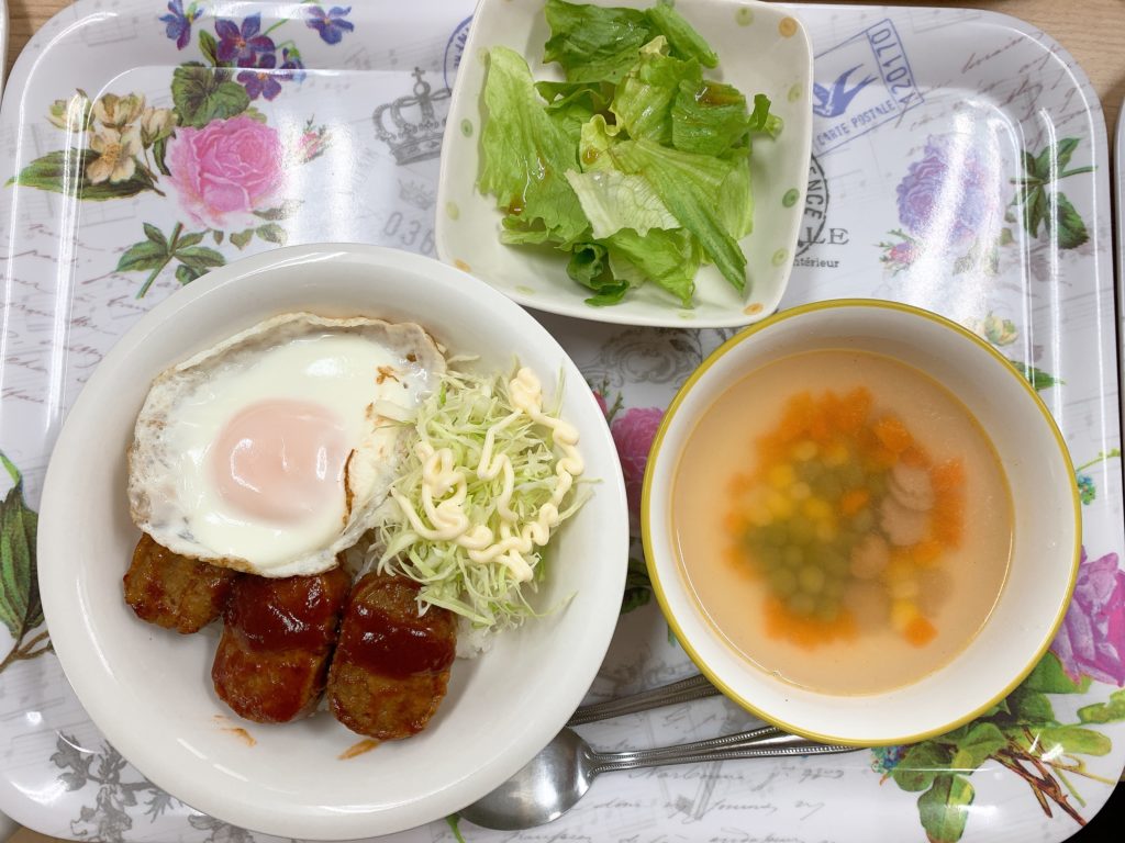 今日の昼食はロコモコ丼、レタスサラダ、野菜スープでした(´ω`)🌺