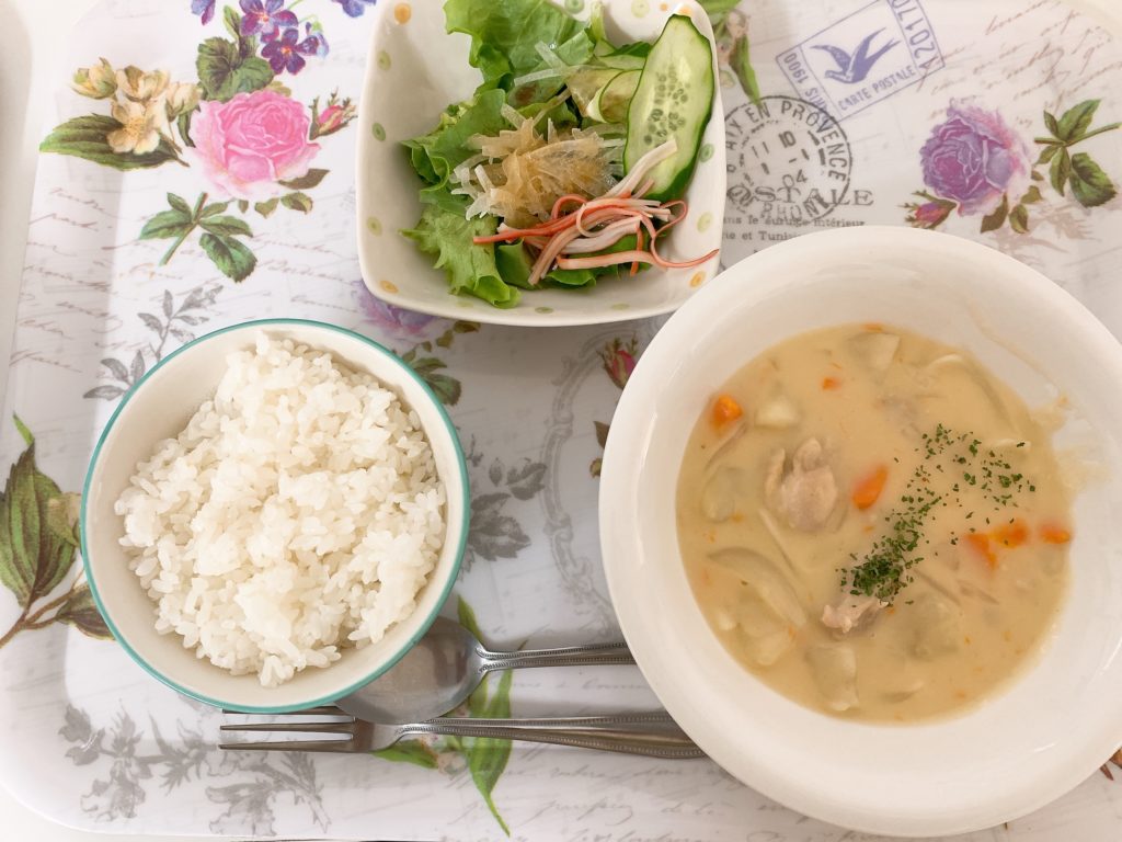 今日の昼食はクリームシチュー、彩りサラダ、白米でした(´っ・ω・)っ