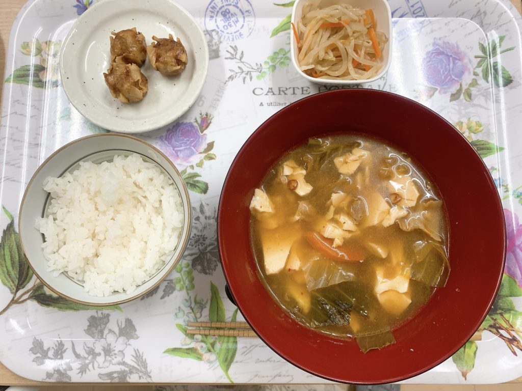 今日の昼食はスンドゥブチゲ、もやしと人参のナムル、揚げシュウマイ、白米でした(*^-^*)