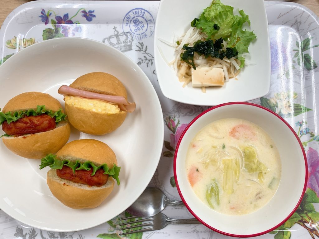 今日の昼食はハムタマゴサンド、ミニホットドッグ、大根サラダ、野菜たっぷりクリームスープでした🐄
