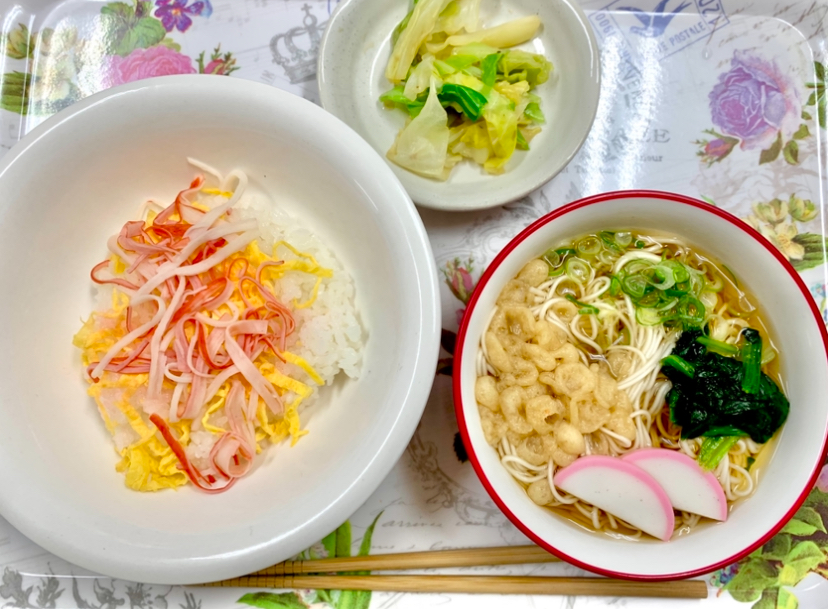 今日の昼食は温そうめん、ちらし寿司、キャベツのおひたしでした(*´Д`)