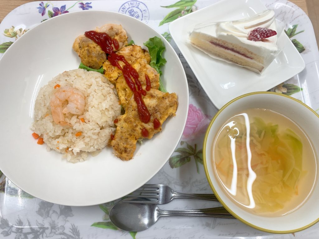 エビピラフ、チキンピカタ、キャベツと人参のスープ、そしてなんと!ショートケーキ🍰❤