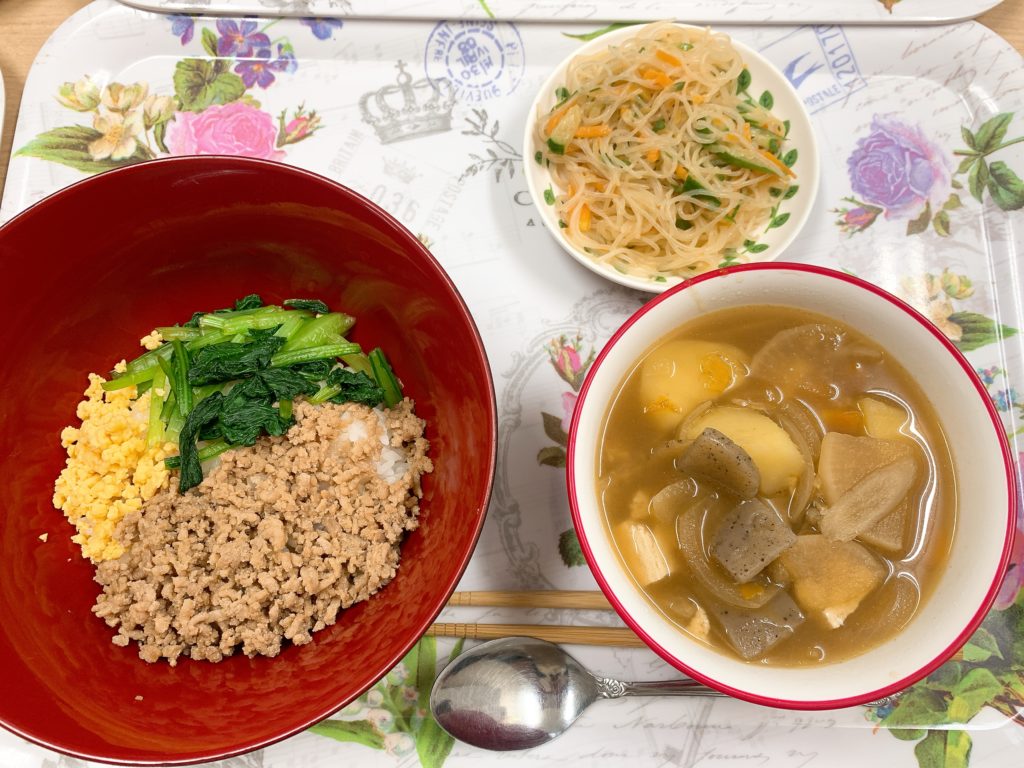 今日の昼食は三色丼、春雨サラダ、けんちん汁でした(´▽`)🎵