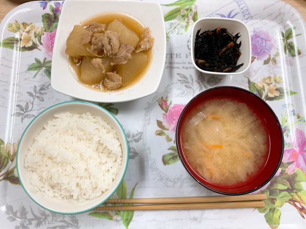 今日の昼食は鶏大根、ひじき煮、玉ねぎと人参の味噌汁、白米でしたヽ(^o^)丿