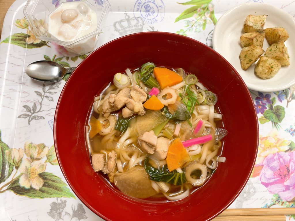 今日の昼食は五目うどん、青のりポテト、ヨーグルト和えでした(●´ω`●)