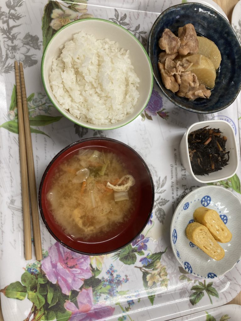 鶏大根、ひじき煮、卵焼き、みそ汁です(‘ω’)ノ