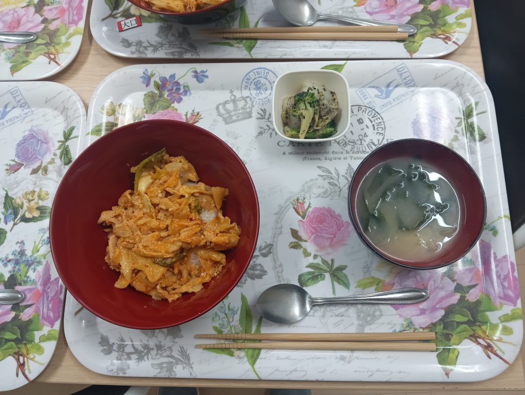 今日のSUNラボご飯は、豚キムチ丼🐖、白菜とブロッコリーの胡麻和え、玉ねぎとわかめのお味噌汁で